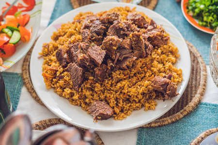 Pilaf with beef, carrots, onions, garlic, pepper and cumin. A traditional dish of Asian cuisine. Selective focus.