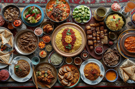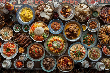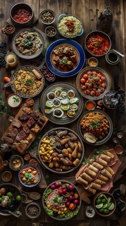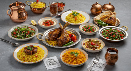 Arabic Cuisine: Middle Eastern traditional lunch. It's also Ramadan Iftar. The meal eaten by Muslims after sunset during Ramadan. Generative AI