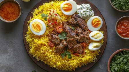Top view of a beautifully arranged platter of biryani, with saffron rice, tender meat, and a side of boiled eggs
