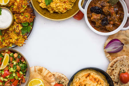 Food frame and text box. Israeli cuisine concept: esik fleisch - beef stew with damson plums and spices, hummus, potato latkes, ptitim, a type of pasta also known as Israeli couscous, pita bread.