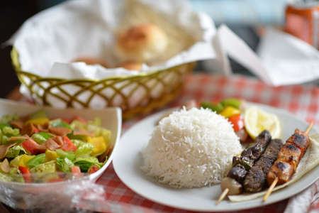 Traditional Turkish and Greek dinner appetizer table with meat, vegetables and spices