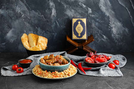 Tasty Asian pilaf with vegetable salad, flatbread and Quran on dark background