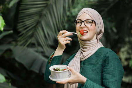 Close-up portrait of muslim business woman holding a vegetable salad in a plastic bowl in one hand and a fork with tomato and lettuce salad in the other.