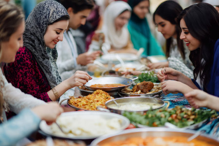 Gathering of friends and family enjoying a meal during a traditional Muslim celebration, embracing the spirit of togetherness and community