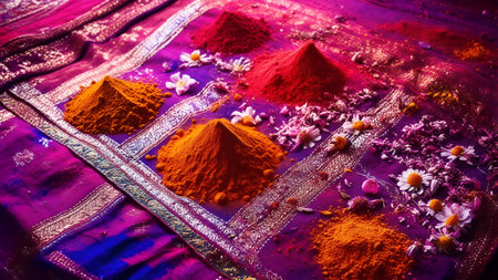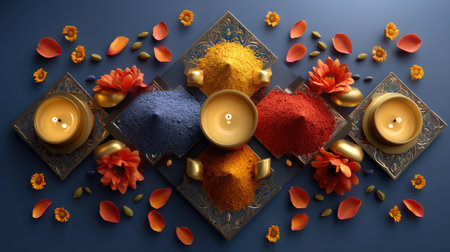 A vibrant and artistic arrangement featuring colorful spices, glowing candles, and fresh flowers symbolizes the essence of festive celebrations, creating an inviting atmosphere.