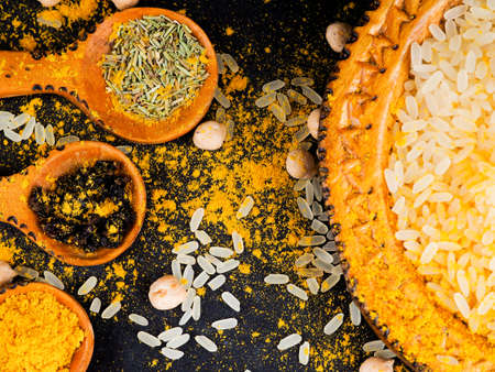 Asian cuisine and spices, rice, chickpeas and turmeric on a plate.