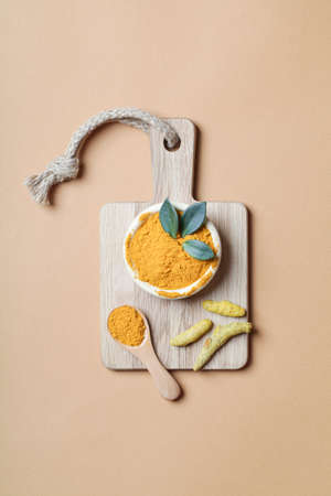 health care lifestyle concept. Curcuma Longa or turmeric powder in bowl with green leaf, wooden spoon and turmeric root on beige background