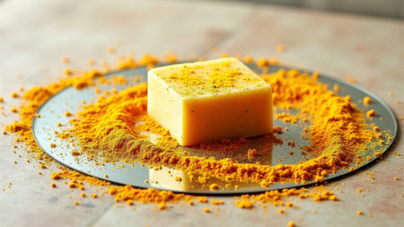 Square butter block on black plate with turmeric powder garnish. That the image is generated using AI.