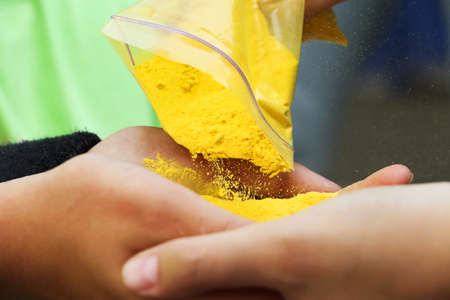 Child hands with dry holi paint.Colour powder for traditional indian festival.Close up photography,copy space.Bright yellow paint.
