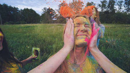 Funny girls are sprinkled with multi-colored powder. Holi holiday.
