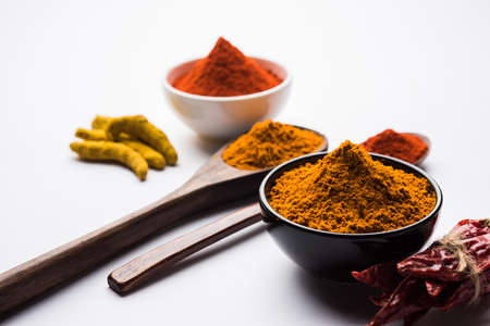 heap of turmeric and red chilli powder in a ceramic bowl on a white or black background