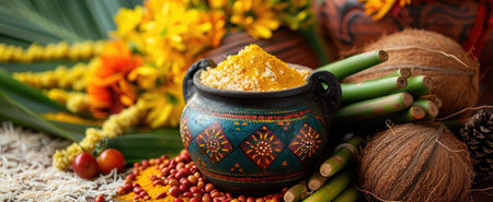 A close-up of a Pongal pot at the center of a festive arrangement. The pot, decorated with turmeric roots and a colorful swatch of fabric, sits amidst offerings of sugarcane, coconut, and fresh harvest vegetables, capturing the essence of the harvest celebration.