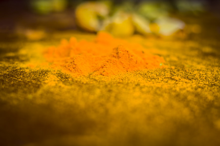 Organic Dry turmeric or Haldi powder also known as curcuma longa linn, selective focus