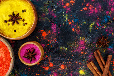 Indian Festival Holi background. Colorful spices on the table.