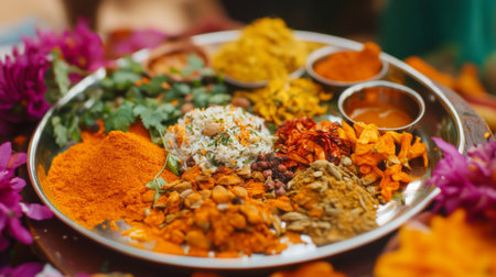 A vibrant plate showcasing an array of spices and herbs, enhanced by colorful flowers, perfect for capturing culinary traditions and cultural celebrations.