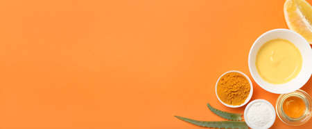Turmeric face mask with ingredients on orange background with space for text