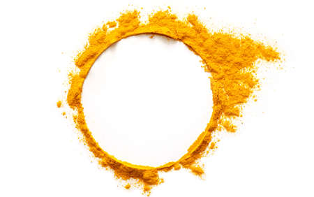 Circle Frame of turmeric powder on white background, healthy promo poster, copy space for text