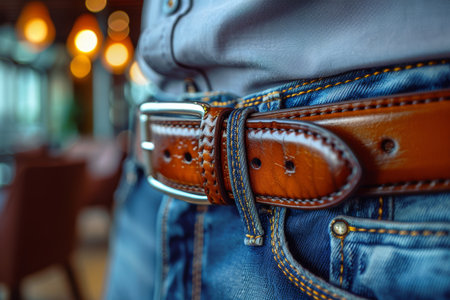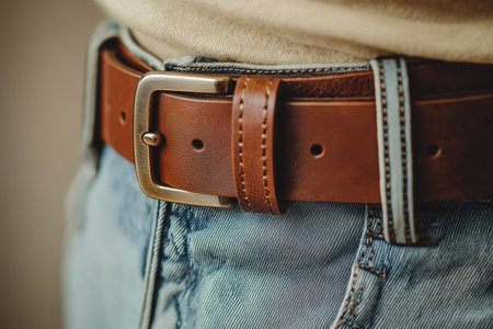Close up view of a beige leather belt on men s jeans showcasing selective focus and texture