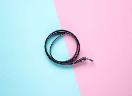 Leather belt on pastel background. Top view, minimalism