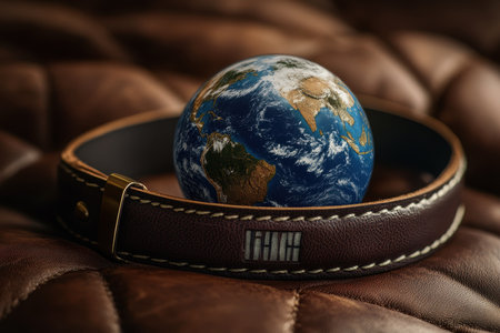 A globe rests inside a brown leather belt, highlighting earthy colors against a luxurious background. This creative display symbolizes connections surrounded by nature and style.
