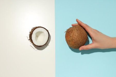 top view of ripe coconut halves on bicolor background