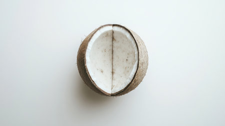 Minimalist image of a halved coconut placed symmetrically, with the pure white background emphasizing its tropical simplicity.