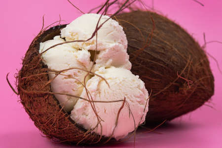 Vanilla ice cream balls in an empty coconut decorated with mint leaves on a pink background.