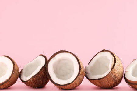 Halves of fresh coconuts on pink background
