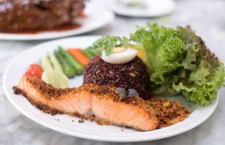 Thai fusion food,Fried salmon and stir fried mushroom and basil with rice and fish sauce chilli