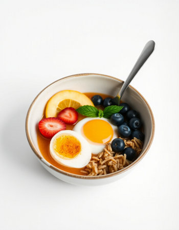 Bowl of oatmeal with eggs, berries and mint on white background