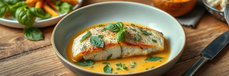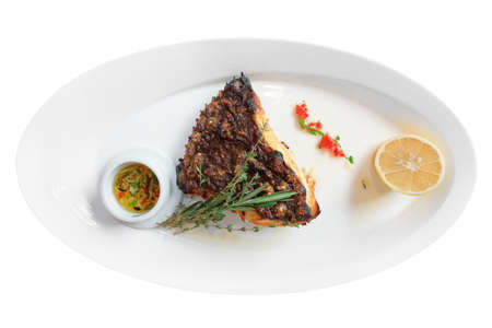 Sea bass fillet steak with lemon sauce served with vegetable on plate