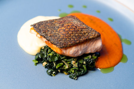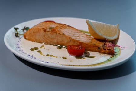 Freshly cooked salmon with vibrant sauce served in a restaurant