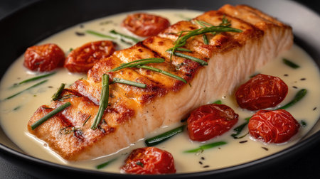 Gourmet Presentation of Grilled Salmon Fillet with Creamy Sauce and Fresh Garnish on Elegant White Plate.