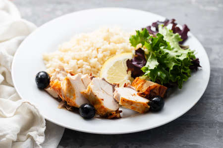chicken with boiled rice and salad on white plate