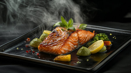 Grilled salmon steak with vegetables on a black plate on a wooden table