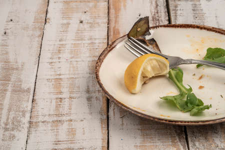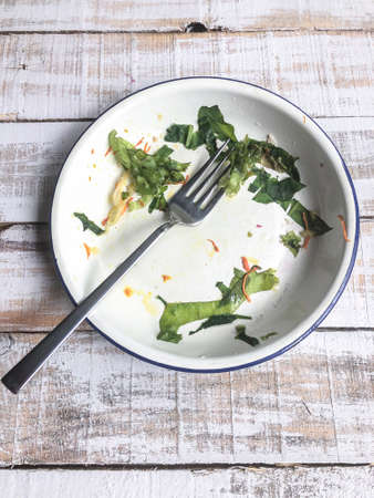 Food leftovers on a dirty plate after vegan lunch, dinner or breakfast with finished salad.