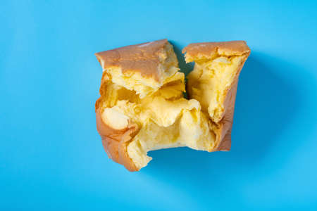 one delicious fresh hearty black and white bitten donut lie on a blue background. junk food and high-calorie food. Packman mood. Top view and copy space