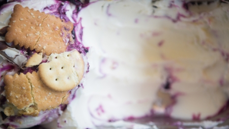 Blueberry cheese cake already eaten left some stain on beautiful luxury ceramic dish with brass fork on wood table