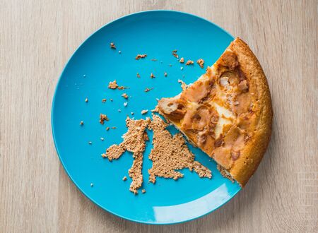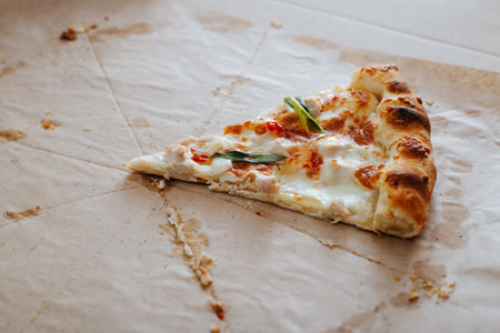 Last slice of pizza, food leftovers on empty pizza cardboard box, top view