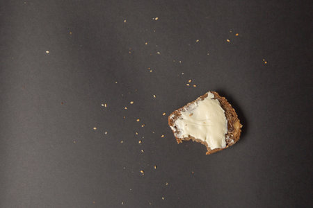 A hand holds a bitten half of a slice of wheat bread. A adult man and a slice of bread against a gray background. Top view.
