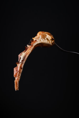 Hand of a man holding a tasty slide of pizza isolate on dark background. Selective focus
