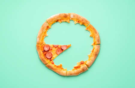 Above view with the crust and a single slice of a pepperoni pizza. Top view with pizza leftovers on a green colored background.