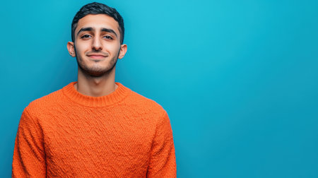 Cheerful young Middle Eastern man in bright orange sweater standing against solid blue background
