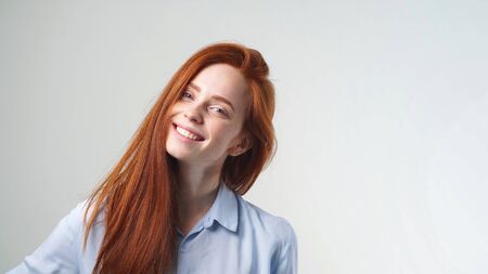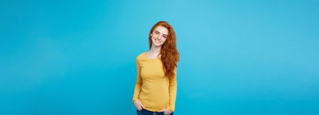Lifestyle concept - Close up Portrait young beautiful attractive ginger red hair girl playing with her hair with shyness. Blue Pastel Background. Copy space