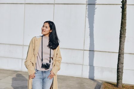 Woman wearing a long beige coat over a knit sweater with a camera hanging from her neck, standing outdoors beside a white wall under bright sunlight, casual fashion and relaxed pose for lifestyle
