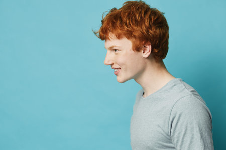 Profile of young man with red hair smiling in grey shirt on blue background. Side view portrait of happy male person with casual hairstyle and light skin in studio.