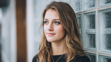 A confident young woman stands by a large window, showcasing her curly hair and natural beauty. The indoor scene offers a modern and bright ambiance, highlighting her serene expression and positive energy.
