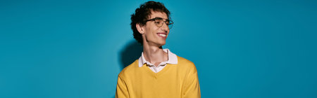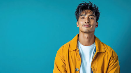 A Stylish Asian man in yellow jacket with cool demeanor against blue background