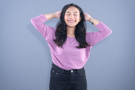 A content young woman with closed eyes, smiling, hands behind head, in purple shirt and jeans