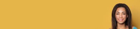 Portrait of smiling mixed race ethnicity young woman. Beautiful face closeup on yellow studio banner background